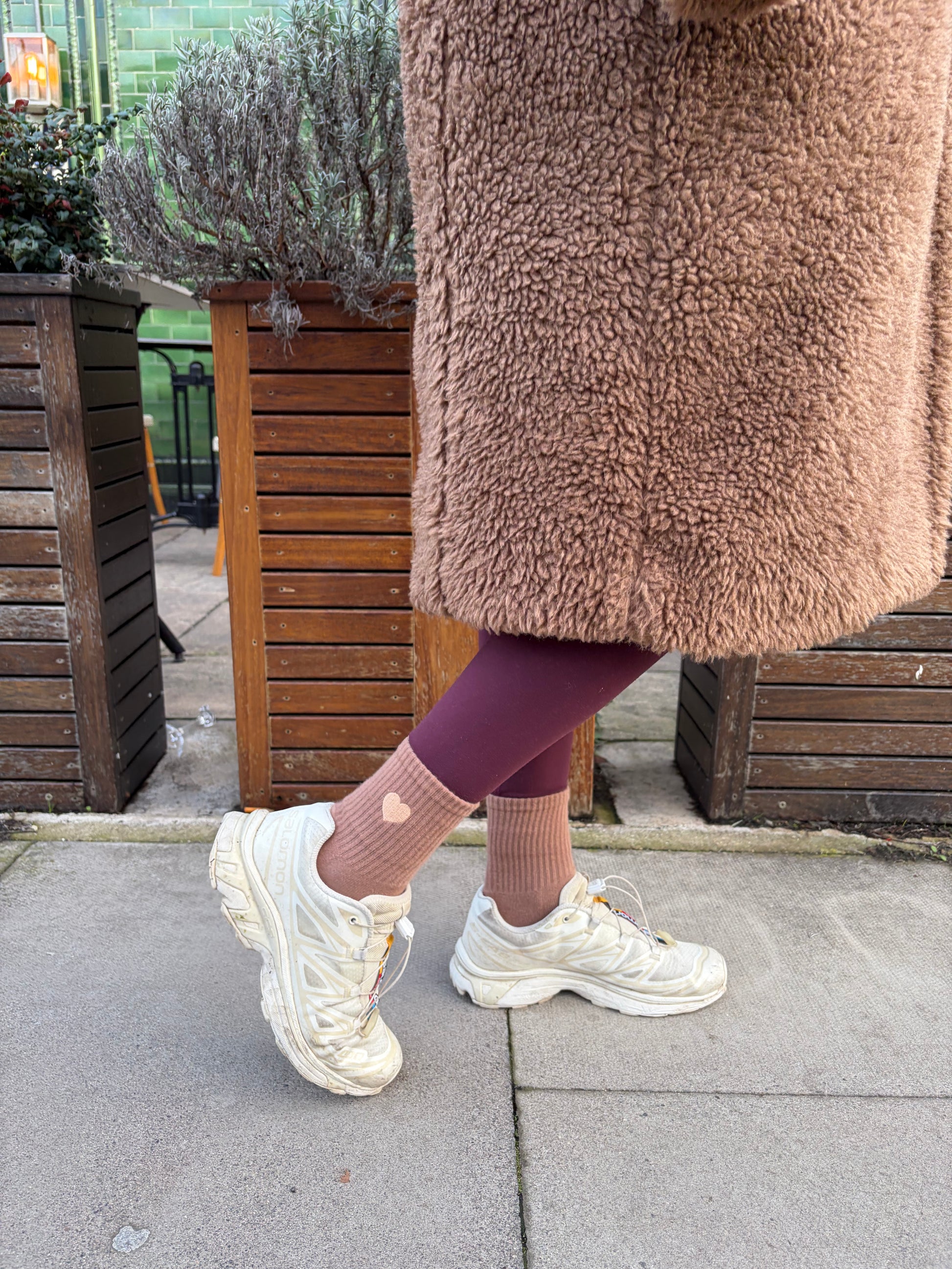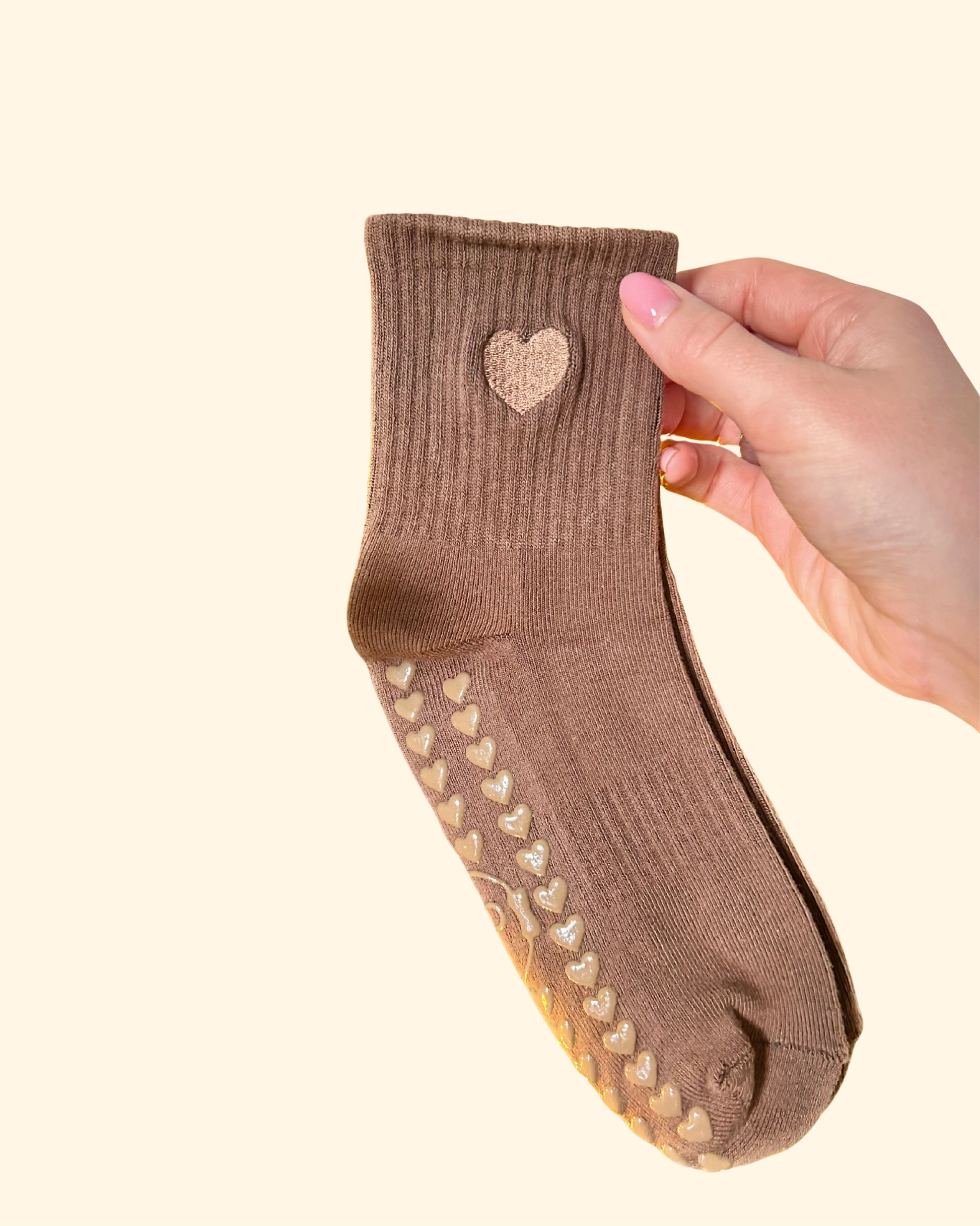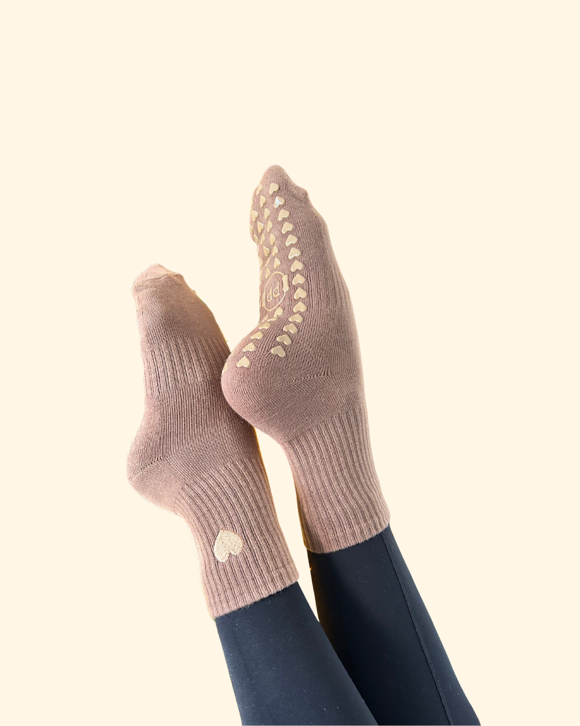 These grip socks come in a warm caramel brown, finished with embroidered heart details on the side and matching heart grips underneath, a subtle, feel-good touch for Pilates lovers.